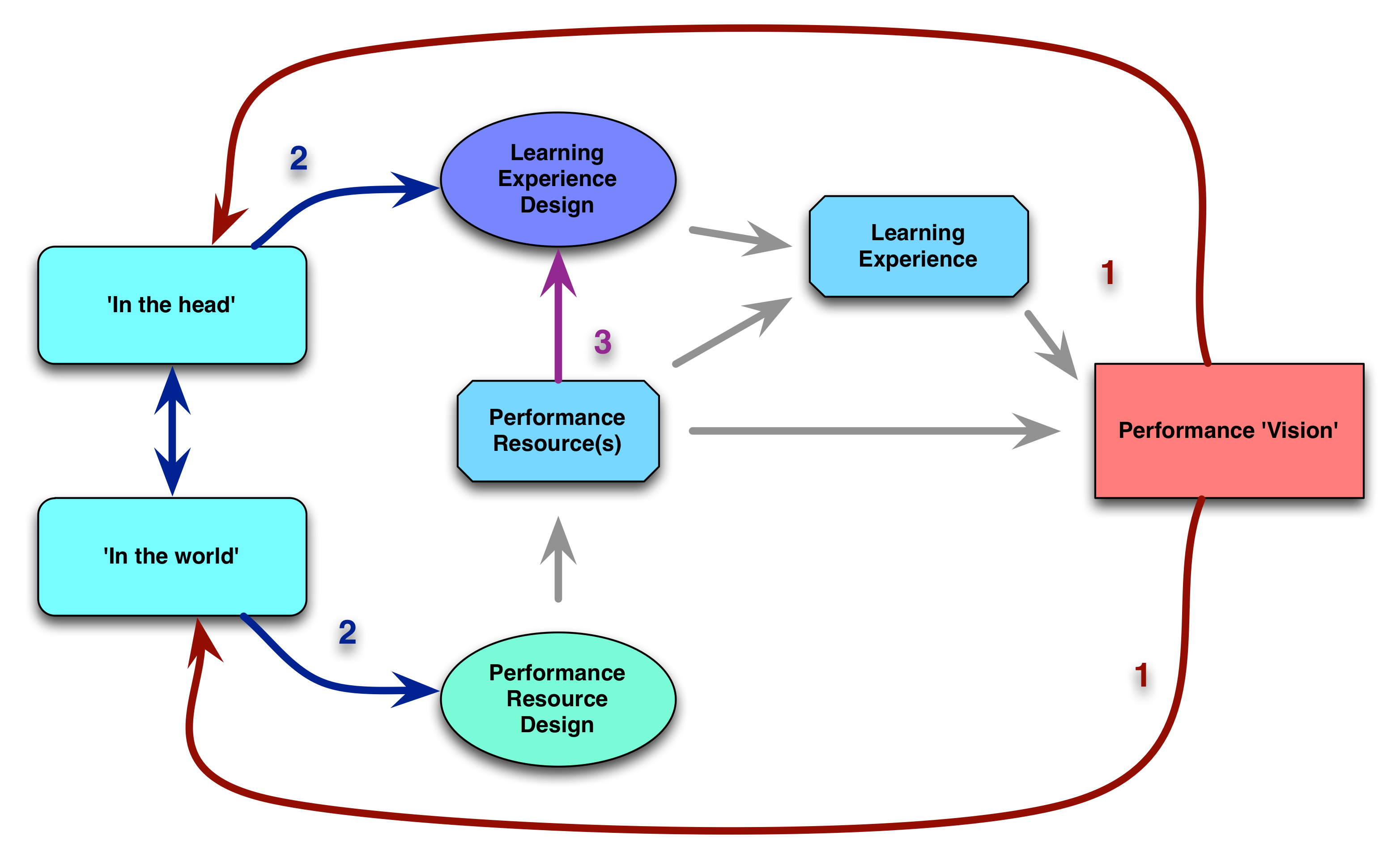 Thus, I’ve ended up redesigning it such that performance resource(s) influence the learning experience design (3), and are available in the learning experience as well as in the performance environment. It’s more complex, but more accurately captures the types of thinking we need to have as designers. We need to create what’s in the world and then prepare what’s in the head to accommodate the new performance environment.