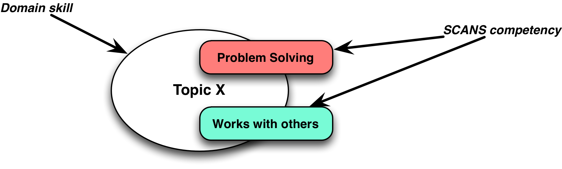 First, you have some domain activity you are having the learner engage in. It might be something in math, science, social studies, whatever (though ideally focused on applied knowledge). Then you give them an assignment, and it might have a number of characteristics: it might be social, e.g. working with others, or problem solving. You could choose many characteristics, e.g. from the SCANS competencies (using information technology, reasoning), that the task entails. That task is labeled with tags associated with the required competency, and tracked via SCORM or more appropriately with the Experience API. There may be more than two, but we’ll stick with that model here.
