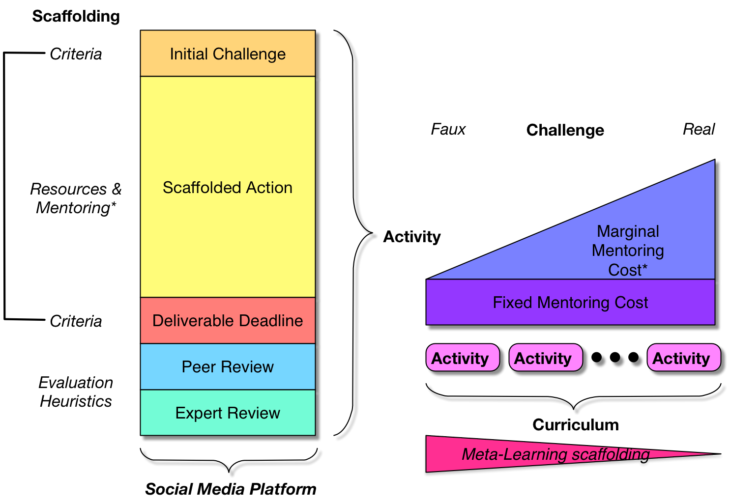 At the deadline, the deliverables are shared for peer review, presumably with other teams. In this instance, there is a deliberate intention to have more than one team, as part of the development of the social capabilities. Reviewing others’ work, initially with evaluation heuristics, is part of internalizing the monitoring criteria, on the path to becoming a self-monitoring and self-improving learner. Similarly, the freedom to share work for evaluation is a valuable move on the path to a learning culture. Expert review will follow, to finalize the learning outcomes.