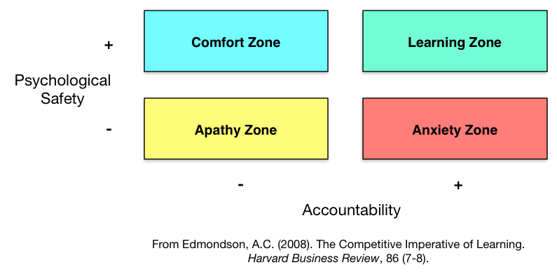 When we talk about the high-minded principles of making it safe and helping people feel welcome, some can view this as all touchy-feely and worry that it won’t get things done. Which isn’t true, but I think it helps if we keep accountability in the picture to assuage those concerns. Ultimately, we want outcomes, but new and improved ones, not just the same old things. The status quo isn’t really acceptable today. In this increasingly dynamic environment, the ability to adapt is key. And that’s the Learning Zone. Are you ready to go there?