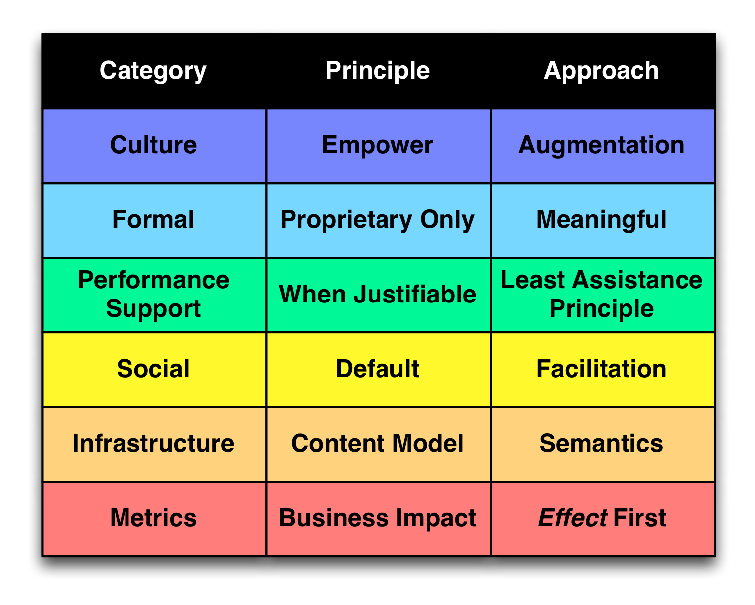 For execution, we have training, performance support, performance coaching, assistance from others by cooperating, and self-designed or acquired support as part of personal knowledge management (PKM). For innovation, we want self-development by personal knowledge management, collaboration amongst individual, mentoring to develop individuals and ideas, and education to introduce new skills ideas. Elements of those components fall variously under formal, performance focus, or eCommunity.