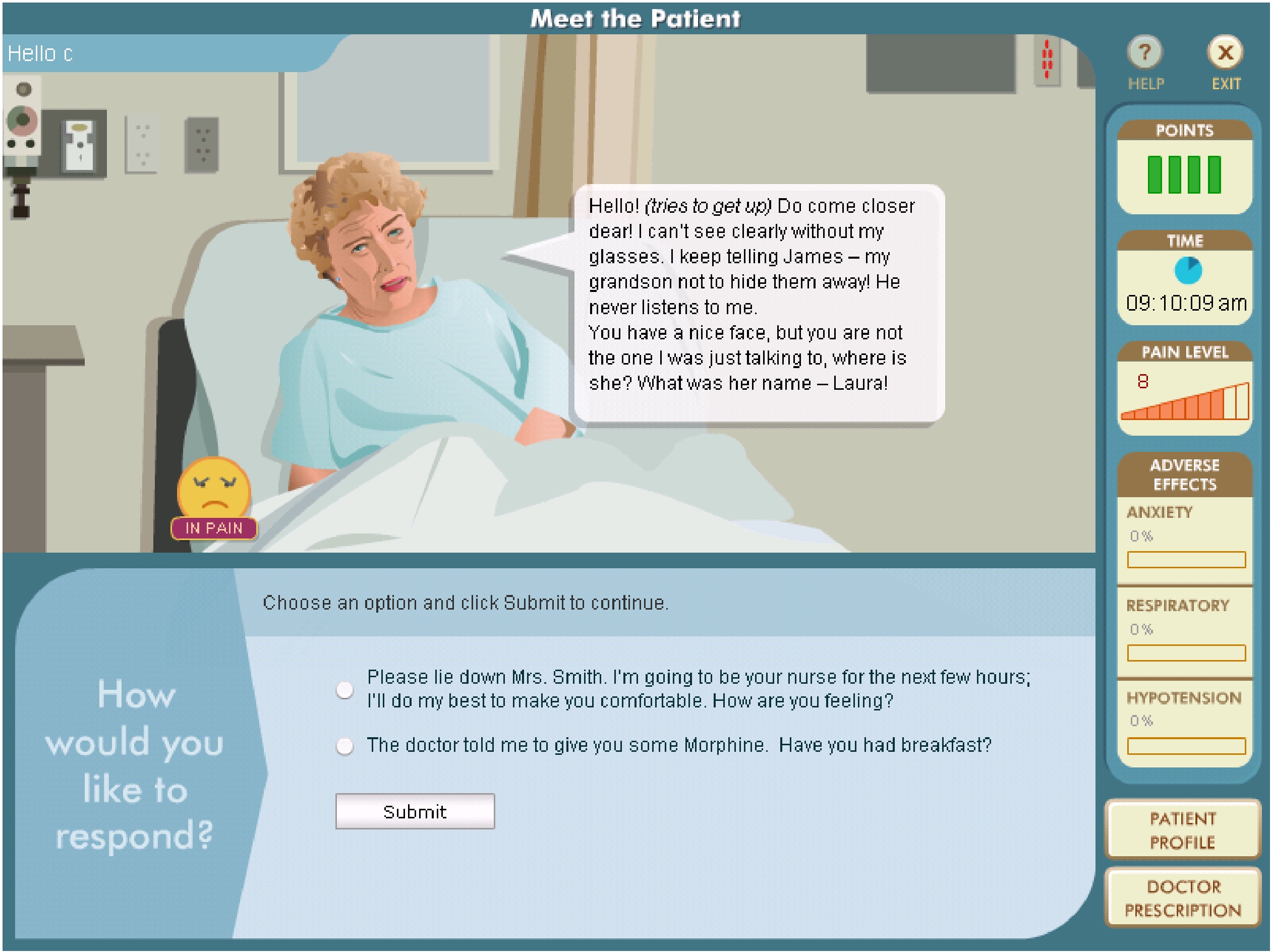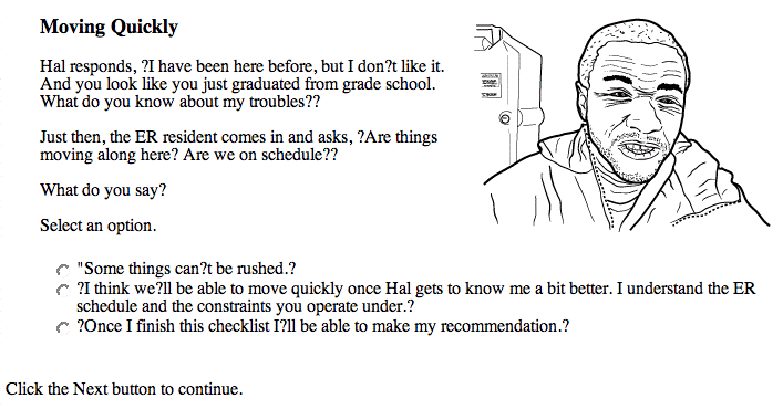 I went on to build first a linear scenario and then a full game on project management (for non-project managers) for a major government organization. This was in conjunction with a team of graphic artists and a software engineer (a bit of that story is also here). I also led design of scenarios for psychiatric nursing. Then I went on and designed a demo game to go with textbooks.