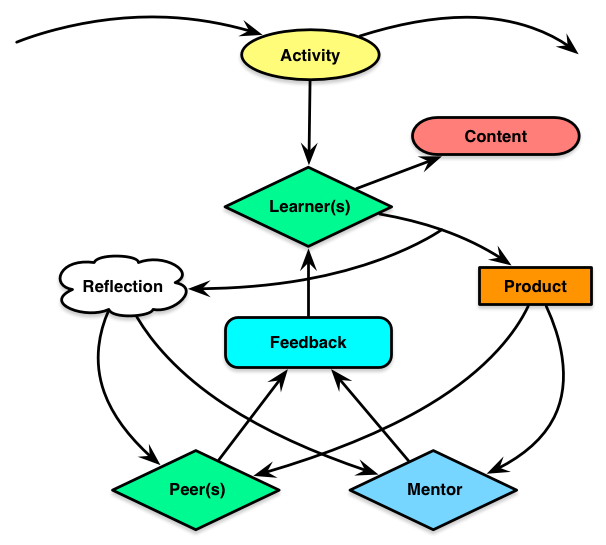 We can wrap the learning around the context. Our individual is in the world, and performing the task. There can be coaching (particularly at the start, and then gradually removed as the individual moves to acceptable competence). There are also performance resources – job aids, checklists, etc – in the environment. There also can be learning resources, so the individual can continue to self-develop, particularly in the increasingly likely situation that the task has some ambiguity or novelty in it. Of course, that only works if we have a learner capable of self learning (hint hint).